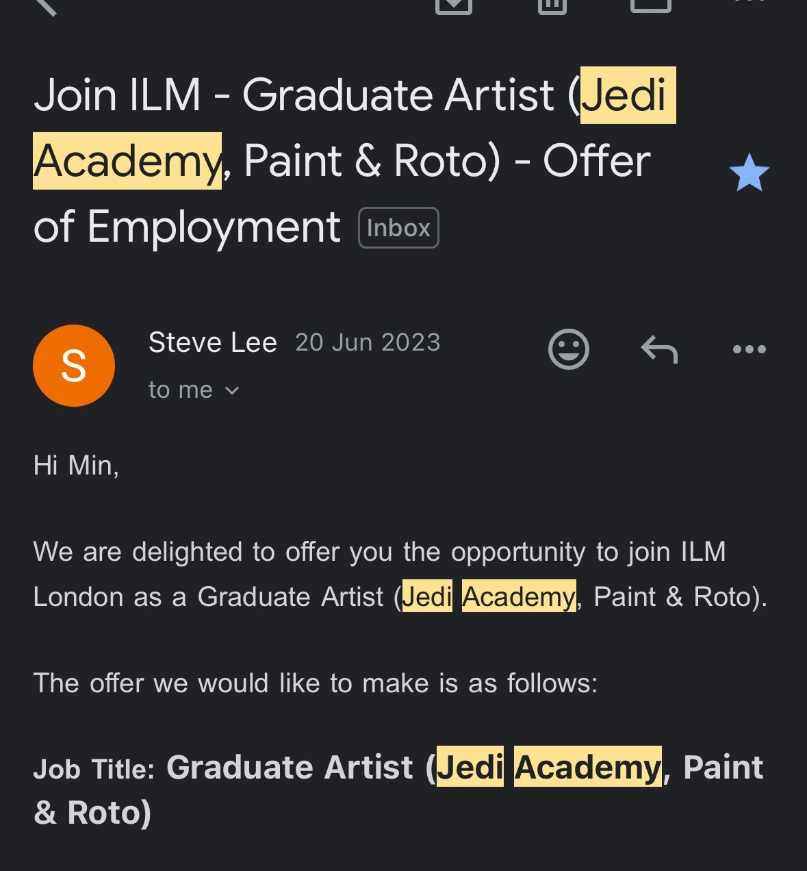 감사하게도, 2주 뒤, 합격메일 오퍼를 받았다! 그것도 내 생일날! 인턴쉽인데, 주니어 아티스트처럼 복지 및 월급을 받는 게 가장 큰 메리트였다. 이제 나도 내 이름을 영화 크레딧에 담는 날이 오겠구나 하면서 한껏 들떴다. 여러 hr 매니저를 거쳐 디즈니 계약서를 작성해야 했기 때문에, 아쉽게도 이 광고회사 퇴사절차를 밟아야 했기에 2주일 뒤에 말씀드렸더니 쿨하게 보내주셨다. ILM이라서 많이 배우고 성장하라고 마지막 말을 해주시고, 그렇게 7월 7일에 사직서를 제출했다.
