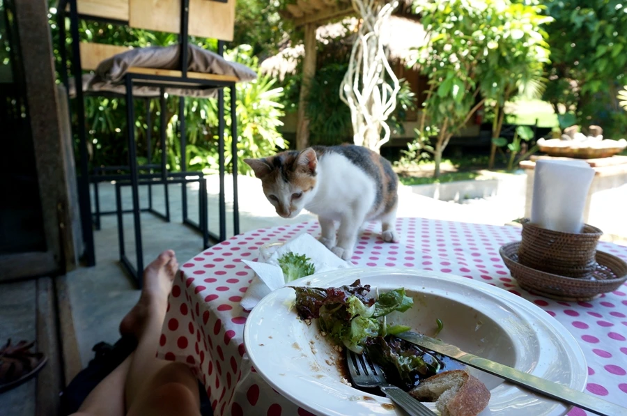 마지막으로 방갈로에 돌아와 짐을 꾸리고 아침을 먹었다. 그림 같은 초록, 파랑, 하양 자연 앞에서 책을 읽으면서 남은 시간을 보냈다. 슬그머니 다가온 고양이 한 마리가 내 배낭에 관심을 보이고 있었다.