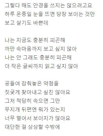 아이유가 스물세 살에 발매하고 나도 스물셋에 들은 노래 ‘안경’에서 아이유는 “더 작은 글씨까지 읽고 싶지 않아” 하는 피곤함을 노래했다. 한창 렌즈에 익숙했던 나는 사물을 더 뚜렷하게 보게 하는 '안경'이라는 소재보다, 사람에 피곤함을 느껴 약간의 거리를 두고 싶은, 자세히 알고 싶지 않은 마음에 더 공감했다.
