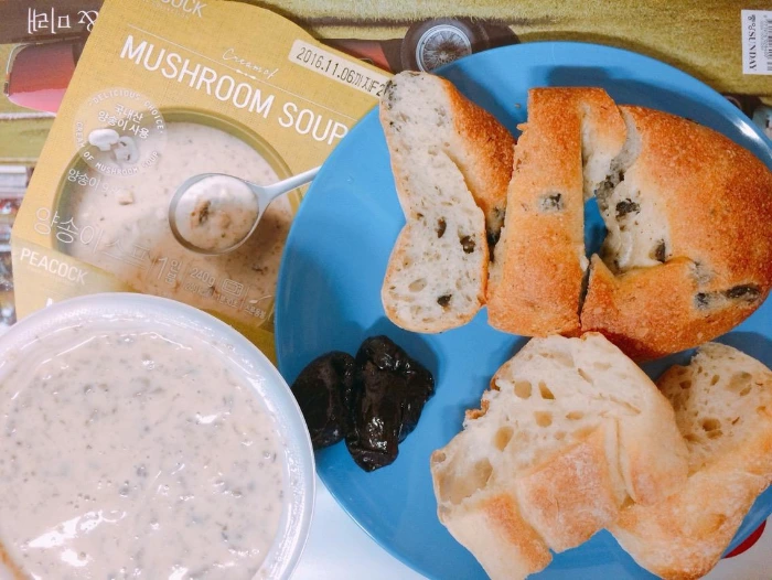 그나마 비건스러운(?) 식사였다. 마침 수프가 너무 먹고 싶어서 가격은 사악했지만 눈물을 머금고 집어들었고(피코크 제품 - 4700원), 이왕 먹는 거 제대로 먹자고 우유, 달걀, 버터 등을 안쓰는 건강빵집에서 고심해서 빵도 골랐다.