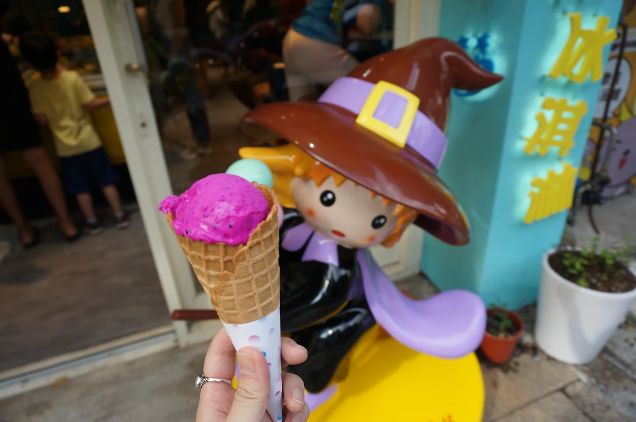 나는 진한 보라색의 용과맛을 골랐다. 색이 참 예뻤다. 가게 맞은편 벤치에 털썩 앉아 아이스크림을 먹었다. 열심히. 천천히. 어릴 때 종종 먹었던 백년초 선인장 맛이 났다. 이어지는 올드 스트릿에서 대왕 카스테라니 대왕 오징어튀김이니 하는 단수이에서 유명한 간식들과 인파를 구경했다. 자전거 때문에 진이 빠졌던지 돌아오는 MRT에선 꾸벅꾸벅 졸았다.