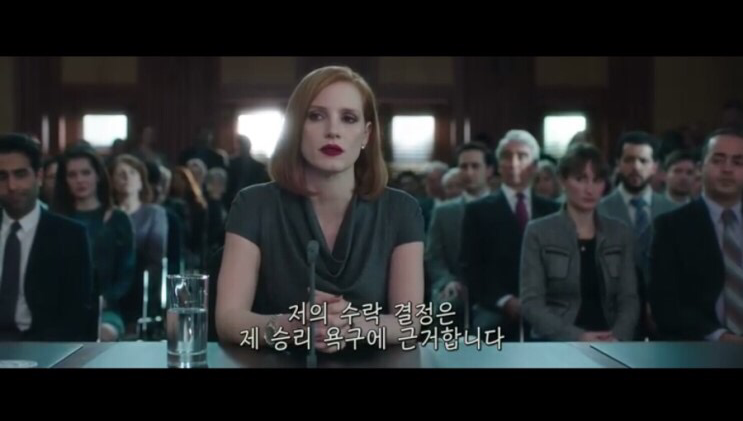 또, 그녀는 말한다. 이것이 그녀 자신의 커리어를 위한 일이었다면, 청문회에 서고 감옥에 들어가는 귀찮은 일들을 겪으면서까지 이 길을 택하지 않았을 거라고. 거대하고 높은 벽처럼 놓인 카르텔을 뛰어넘겠다는 욕망으로 슬로운은 수단과 방법을 가리지 않고 싸운다. 난공불락이던 총기 규제 강화 법안을 통과시킨다. 때로는 자기만을 향하던 욕망이 사회의 변화를 위하는 욕망과 만나 하나의 선을 그리며 꽂히기도 한다.