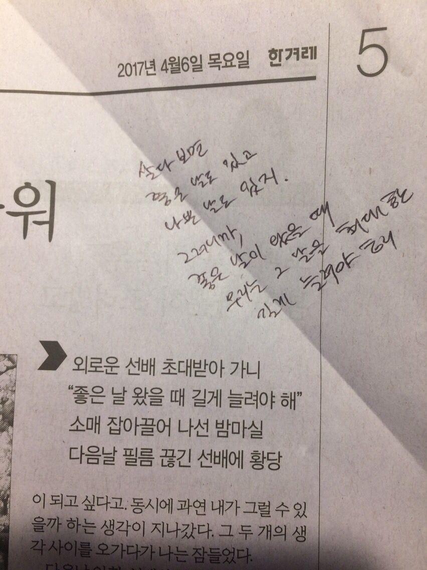 신문지를 팍팍하게 넘기다가도 멋진 구절을 발견하면 급정지하고 꼭 한 번씩 써본다.