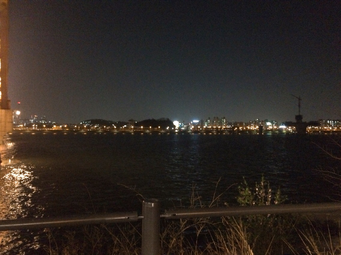 물 앞에 앉아 치킨을 뜯고 맥주를 들이켰다.