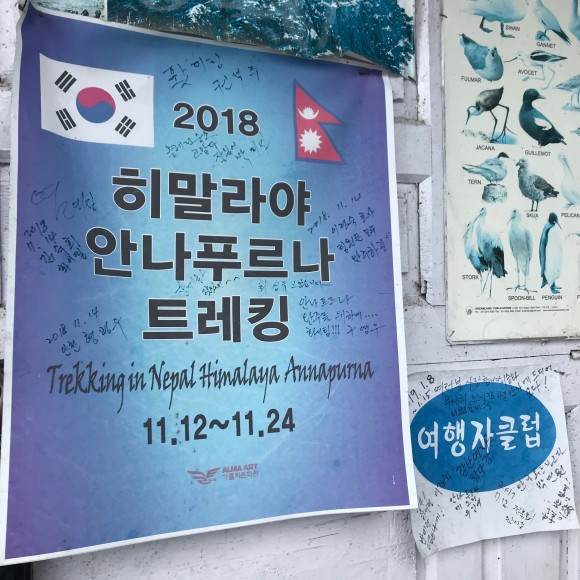 가이드 시리한테 들어보니, 안나푸르나 베이스캠프 루트에 위치한 롯지에서는 메뉴가 전부 다 통일되어 있다고 한다. 시누와, 촘롱을 제외하고 모든 땅이 국유지기 때문에 중앙에서 재료를 공급받아 음식을 제공하고, 덕분에 일원화된 메뉴로만 제공하는 시스템이라고 설명해주셨다. 그렇다는 말은 시누와와 촘롱은 유일한 사유지로 롯지에서 자체적으로 음식을 제공할 수 있다는 것이었다! 김치찌개, 김치볶음밥 같은 한식 메뉴와, 기력을 회복하기 위한 닭백숙, 뿐만 아니라 직접 한국 쌀을 수입해서 조리하기 때문에 쌀맛도 다르다고! 사실 나는 이때부터 시누와에 도착하게 될 순간만을 고대하고 있었던 걸지도 모른다. 아무쪼록, 베테랑 가이드 덕분에 트레킹 하면서 네팔에 대해 이것저것 주워들은 게 많아서 더 재밌었다.