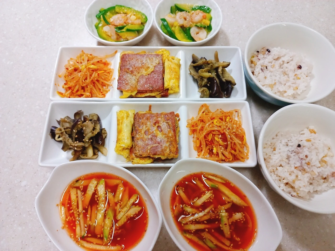 이렇게 후다닥 만든 빨간 콩나물무침, 가지무침, 호박새우볶음까지 준비하니 둘째가 학원을 다녀와 주방을 쓱 보며 기대한 얼굴로 묻는다.