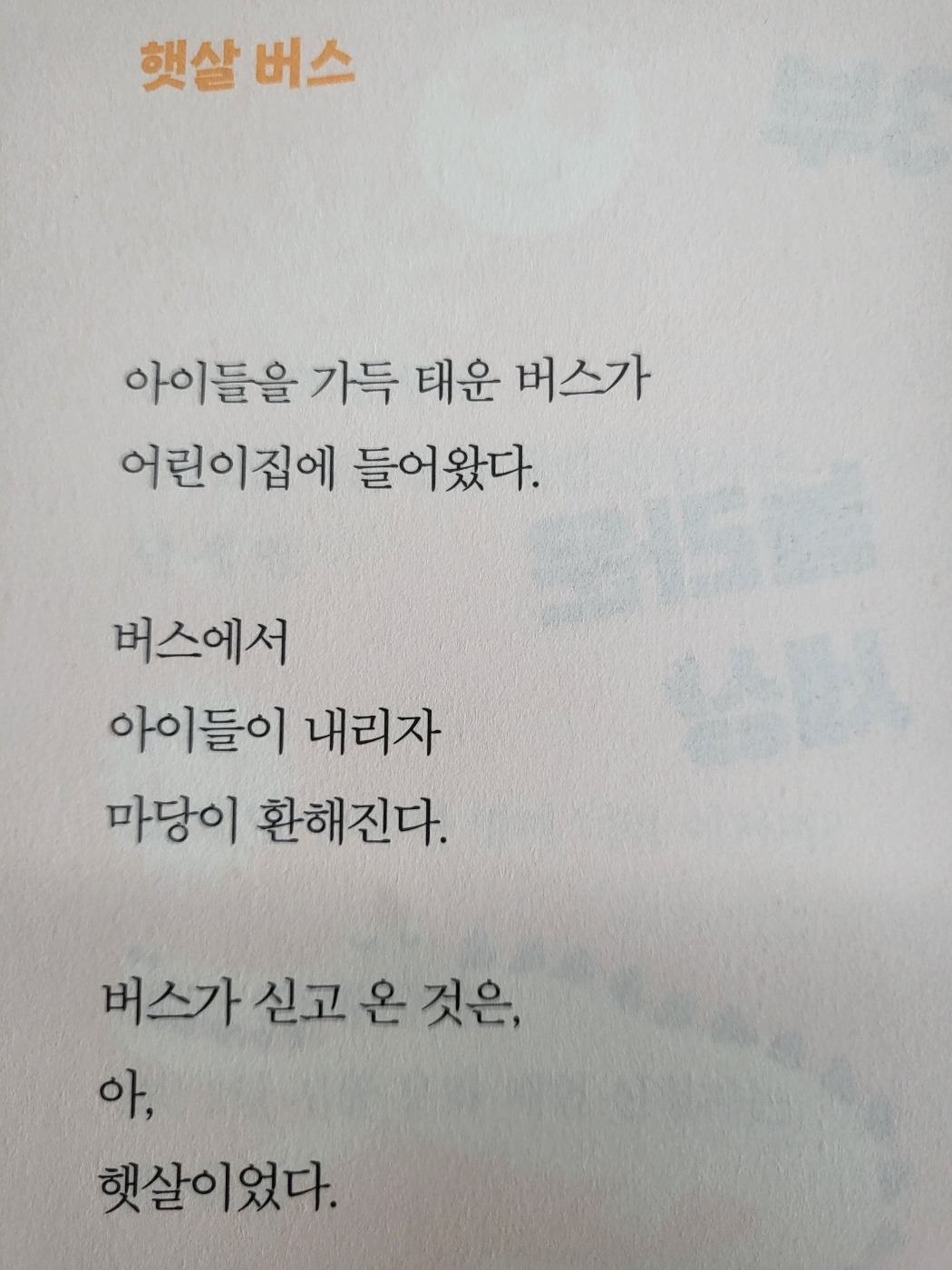마지막으로 소개할 시 <햇살 버스>처럼 그림이 없어도, 웃으며 내리는 어린이들을 환하게 떠올 릴 수 있는 것처럼 말이다. 이 시를 읽고 어린이집 버스를 볼 때면 이 시가 생각나곤 했다. 많은 사람들이 이렇게 쉽게 떠올릴 만한 많은 시를 가슴에 품었으면 좋겠다.