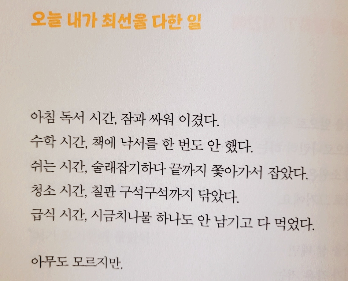 그런 의미에서 <오늘 내가 최선을 다한 일>은 아이들에 대한 관찰이 돋보인다. 아이는 잠과 싸워 이겨서 독서를 해냈고, 지루한 수학 시간에 책에 낙서도 안 하고 버텼으며, 술래잡기를 할 때 끝까지 최선을 다했다. 칠판을 닦을 때도 아무도 신경 쓰지 않는 구석까지 최선을 다해서 닦았고, 급식시간에 시금치나물을 한 개만 먹은 것도 아니고 안 남기고 다 먹었다. 크게 눈에 띄지는 않는 행동이라 아마도 선생님에게 칭찬받지는 못했을 것이다. 하지만 이런 행동들이 아이 본인에겐 최선을 다한 일임은 틀림없다. 칭찬을 받으면 좋겠지만 칭찬을 못 받는다고 해도 이런 일들이 내가 최선을 다한 일이라는 걸 아이가 아는 것은 중요하다. 외적동기보다 내적동기가 훨씬 더 가치 있는 법이니까. 다른 사람은 몰라도 나 스스로 알고 있는 것이다. 어른이 보기에 아무것도 안 하는 것처럼 보이지만 아이들은 하루에도 많은 일에 도전하며 실패하기도, 성공하기도 하며 열심히 살아간다. 어른만큼이나 치열할 아이들의 일상을 이런 시 한 편이 응원해 줄 수 있을 것이다.
