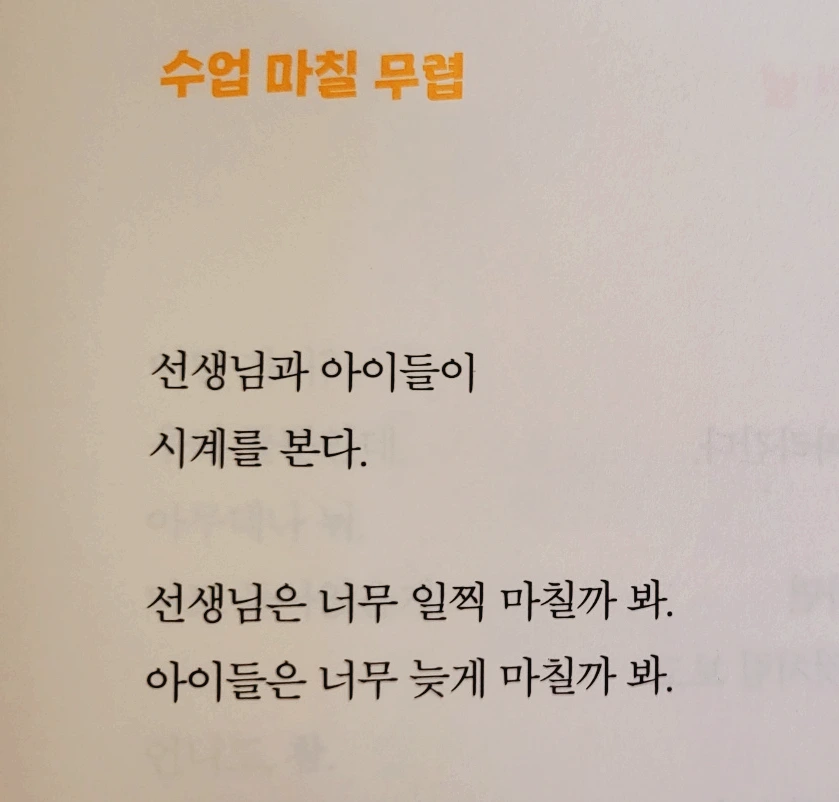 <수업 마칠 무렵>은 읽으면서 교사로서 가장 크게 공감한 시다. 쉬는 시간이 다 되어 가면 아이들과 시작되는 눈치 작전. 쉬는 시간이 다 되어가면 아이들 계속 시계를 본다. 아이들이 시계를 흘깃 보는 모습을 보고 쉬는 시간이 되어감을 알아차릴 때도 많다. 40분을 책상에 앉아있는 고통의 보상은 고작 쉬는 시간 10분이지만 아이들은 그 10분을 얼마나 알차게 노는지 모른다. 그래서 쉬는 시간은 꼭 지켜주고, 너무 신나게 놀고 있으면 몇 분 시간을 더 주기도 한다. 사실 아이들만큼이나 선생님도 쉬는 시간을 기다린다.