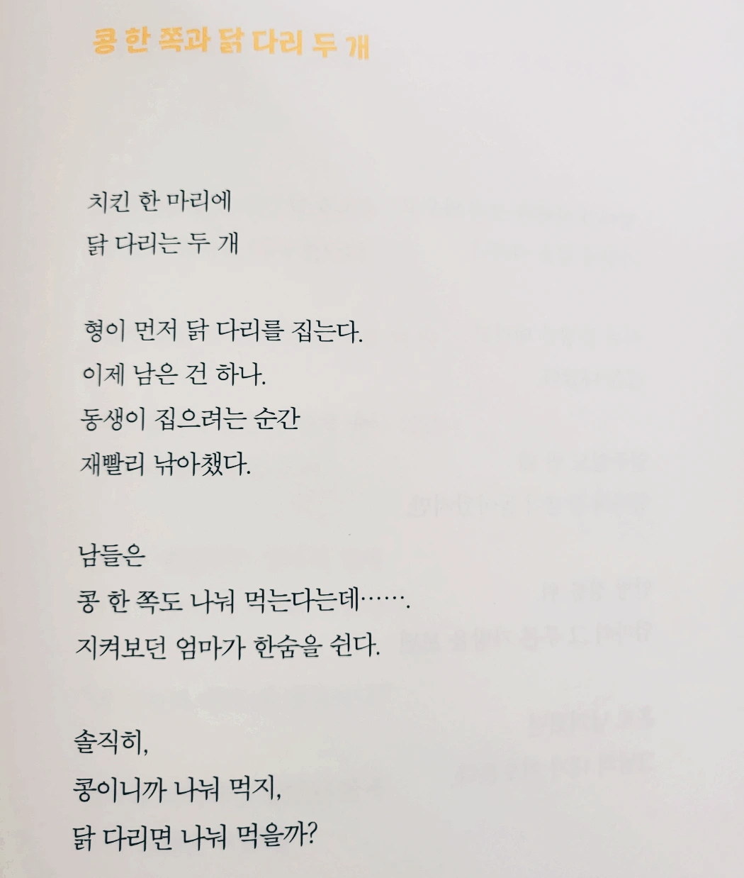 재미있었던 시 중에 <콩 한 쪽과 닭 다리 두 개>라는 시를 보자. 치킨 닭다리를 먼저 먹겠다고 싸우는 아이들을 향한 '콩 한 쪽도 나눠 먹는다는데'라는 엄마의 한숨 섞인 말을 들은 아이의 생각이 재밌다. 아이가 생각하기에 콩과 치킨은 처음부터 비교 대상이 아니다. 하늘과 땅차이다. 어른이 당연하다고 생각하는 말에 딴지를 거는 것은 아이이기에 할 수 있는 일이다.