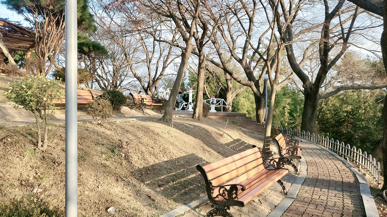 이곳이 좋은 또 하나의 이유는 책을 읽거나 공부를 하다가 지루할 때 걸을 수 있는 산책로와 오래된 벤치들 때문이기도 하다. 그때 앉아있던 그 의자들은 색칠만 덧 씌워진 채 그대로 있다. 그 벤치에 앉아서 대나무 숲에서 들리는 바람 소리, 가끔 존재를 나타내는 새소리를 들으며 멀리 남강을 보고, 남강처럼 맑은 하늘을 보고 있노라면 머릿속이 상쾌해진다. 신발을 타고 오르는 개미들도 반가울 정도로.