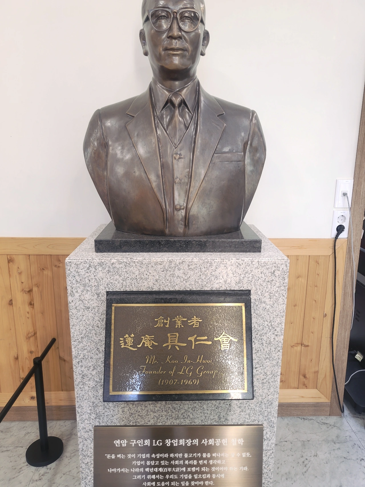 도서관에 들어서면 한 인물의 동상이 사람들을 반긴다. 바로 LG그룹 창업주인 구인회 회장이다. 도서관의 이름인 '연암'은 구인회 회장의 호이다. 그는 고향 진주에 도서관을 짓고 진주시에 기부했다. LG그룹 창업주뿐 아니라 삼성 창업주 이병철 회장도 진주 지수초등학교의 전신인 지수공립보통학교를 다녔다. 이렇듯 진주에는 기업가가 많이 나와 기업가의 도시라고 진주시에서 열심히 홍보하고 있다. 뭐 그런 사실들이 나에게 다 무슨 소용이야하고 시니컬하게 생각하다가도 내가 가장 애정하는 이 도서관을 떠올리자면 아주 큰 혜택을 받은 것 같다. 도서관 건립과 관련된 LG 관계자 여러분, 존댓말로 인사할게요.