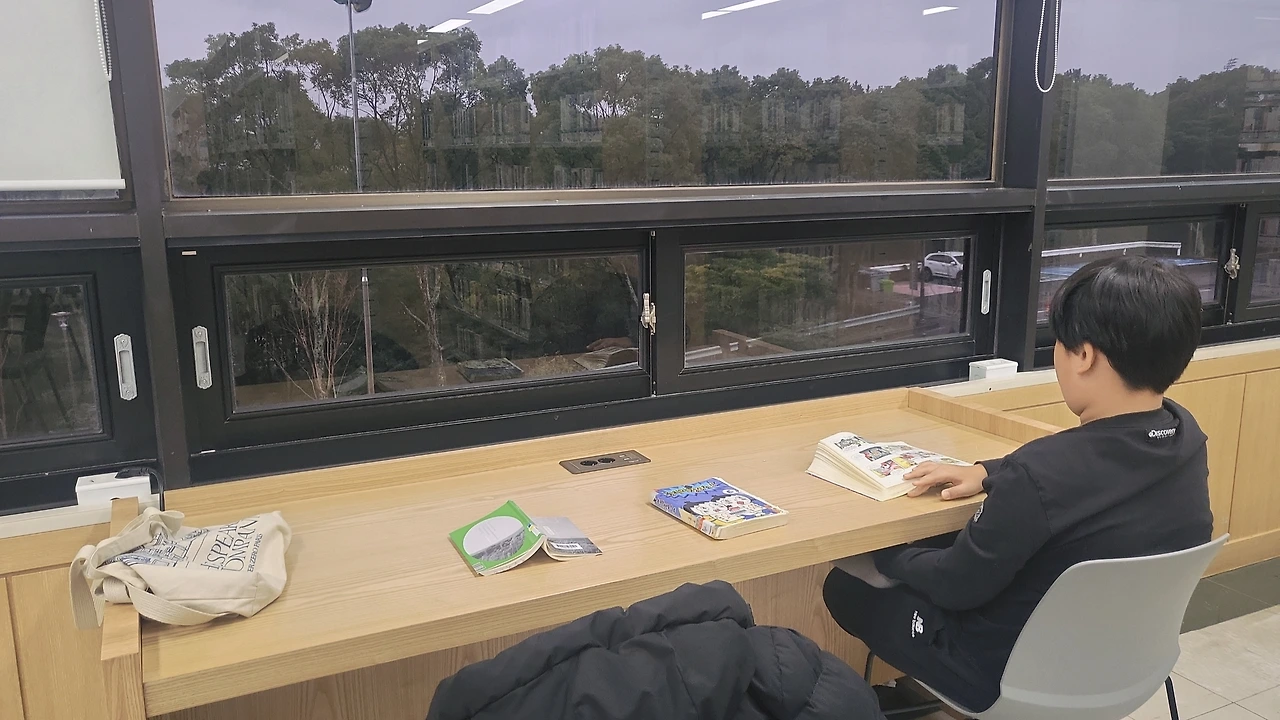 어디 도서관에 가든 내가 가장 좋아하는 자리는 창가 자리다. 다른 사람의 시선을 의식하지 않고 편안하게 책을 읽을 수 있어서 좋다. 창가자리가 마침 비어있어 기분 좋게 자리를 잡았다. 아이는 그토록 찾았던 인기 웹툰 [놓지 마 정신줄]에 금방 빨려들어간다. 다른 도서관에는 몇 권 없었는데 우당도서관에 시리즈가 많다며 기뻐한다.