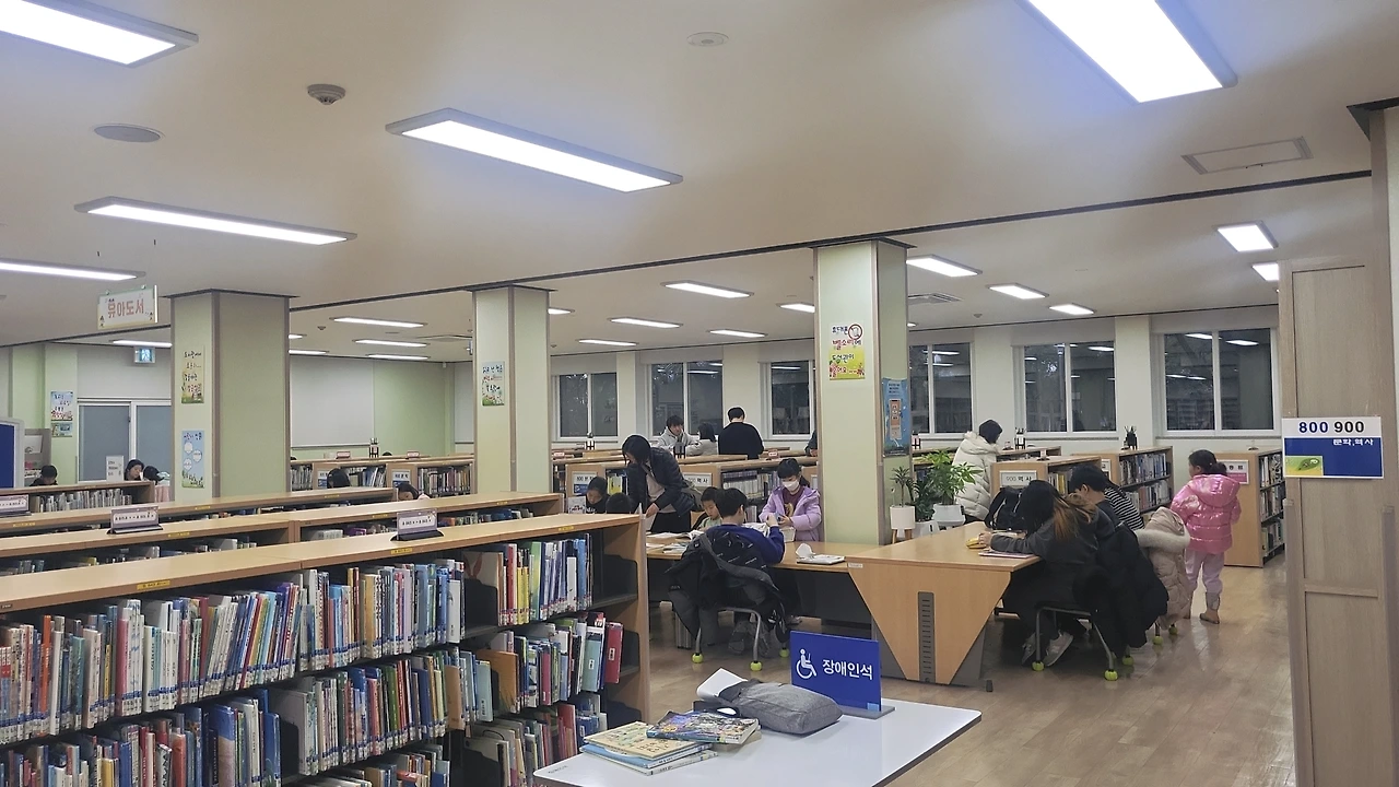 아이와 1층 어린이자료실에 들어가 보았다. 평일인데도 빈자리가 없을 정도로 책을 읽고 있는 아이들과 부모님들이 많았다. 인상적인 것은 육아서 코너가 따로 있어 어린 자녀와 부모가 함께 공간에 머물기 좋다는 점이다. 또 한쪽에 학습 만화 코너가 따로 있는데 역시 그 책상에 앉아있던 아이들의 독서 열기가 특히 뜨겁게 느껴졌다. 아이가 읽고 싶어서 검색해 본 책이 어린이자료실에 없었다. 우리는 여행자라 열람만 가능하기에 성인책이 있는 종합자료실에서 같이 읽을 수 있어서 오히려 반가웠다. 아이가 이렇게 말한다.