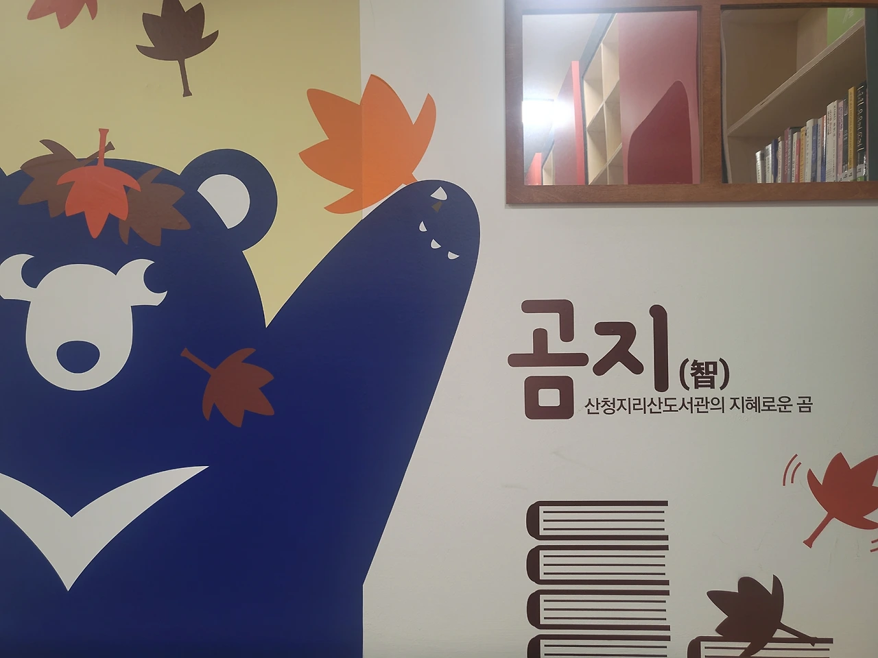 지리산도서관의 입구부터 내부 곳곳에, 화장실까지 귀여운 곰이 그려져 있다. 지리산도서관을 상징하는 지혜로운 곰, '곰지'라고 한다. 지리산에 사는 반달가슴곰을 떠올리게 한다. 캐릭터를 활용한 도서관은 그전에 본 적이 없는데, 신선하게 느껴진다. 아이들은 물론일 테고 어른인 나도 친근하게 귀엽게 느껴졌다.