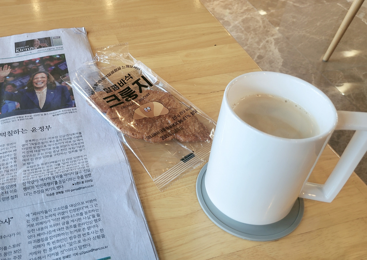 카페에서 달콤바삭 크룽지와 아메리카노를 마신다. 심지어 아메리카노가 디카페인이 있다니 감동이다. 바삐 집에서 나오느라 읽지 못한 오늘자 신문을 읽는다. 신문을 들여다보니 온통 답답한 소식뿐이다. 하지만 신문에서 시선을 옮기면 시원하고 아늑한 카페에서 크룽지를 아그작 거리며 따뜻한 커피를 마시는 이런 여유가 감사하고 또 감사하다. 낯선 곳에서 혼자 보내는 이런 시간은 늘 설렘을 준다. 알아볼 사람도 없는 곳에서 나만 혼자 섬처럼 있는 이방인의 느낌이 참 좋다.