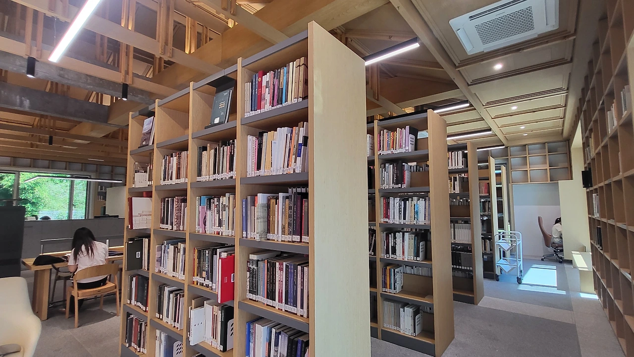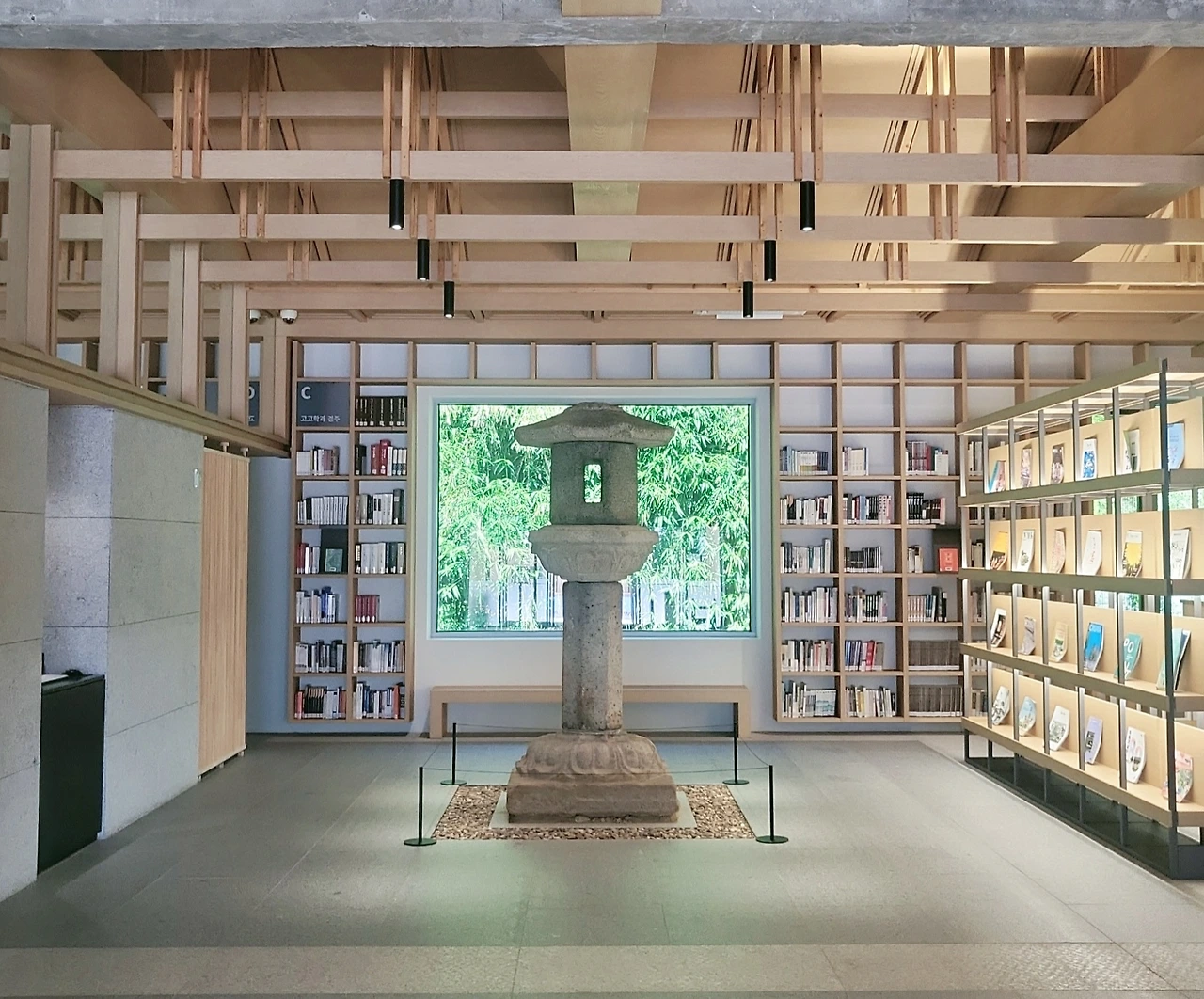 들어서자마자 석등이 반겨준다. 석등은 도서관에 있기 얼마나 어울리는 물건인가. 차가운 돌로 만들어졌지만 따뜻하고 밝은 불을 가만히 품어준다. 석등 뒤로 액자 같은 창문에 대나무가 보인다. 도서관 안에서 보는 여름은 더위는 없고, 그저 싱그럽고 푸르기만 하다.