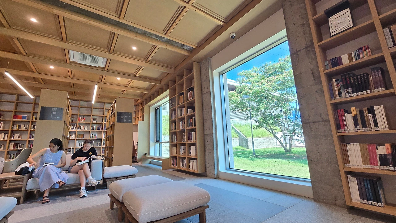 도서관을 둘러보았다. 그리 크치 않은 크기였지만 곳곳에 다양한 의자가 놓여있어 취향에 맞게 도서관에 머무르기 좋았다. 입구 왼쪽에는 경주박물관 특별전시 주제인 '고려청자'에 관한 책들이 큐레이션 되어있었다. 그리고 입구 오른쪽에는 서가가 나란히 줄을 맞춰 서있다. 도서관 벽은 크기가 다양한 창문들이 여름을 한 폭의 액자에 담은 듯했다. 책을 보다 고개를 들면 싱그러운 여름을 느낄 수 있어 책을 읽지 않아도 눈과 마음이 편안해진다.