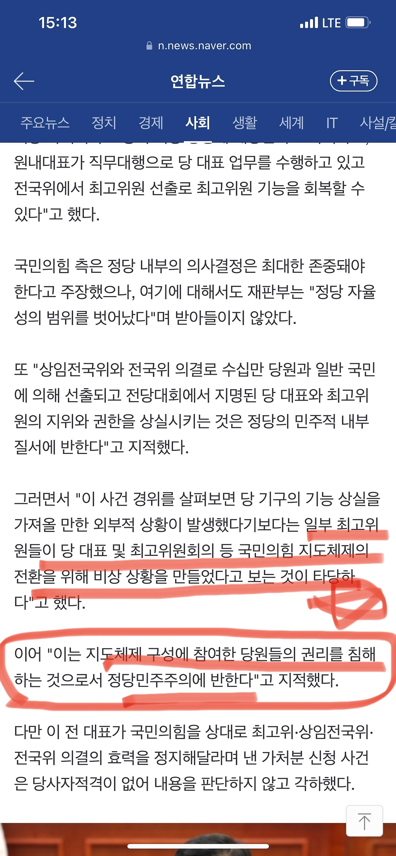 보시면 지도체제 구성에 참여한 당원들의 권리를 침해했고 이것이 정당민주주의에 반한다고 되어 있습니다.