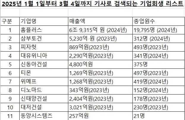 '25.1.1.~3.4.까지 기업회생으로 검색하면 나오는 기사들 중 일부만 추려보았습니다.