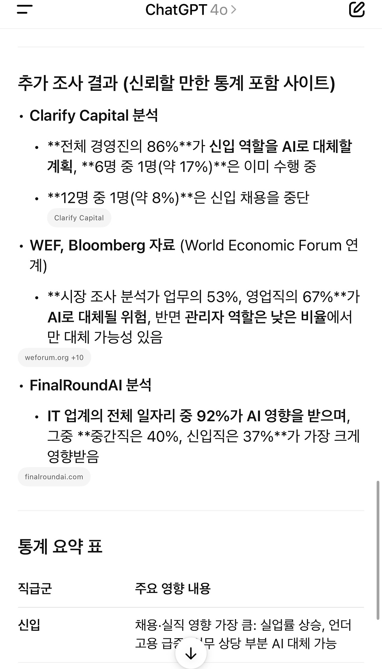 이처럼 사원급은 이미 AI로 대체당하고 있으며 신입은 뽑지 않기 시작했습니다.