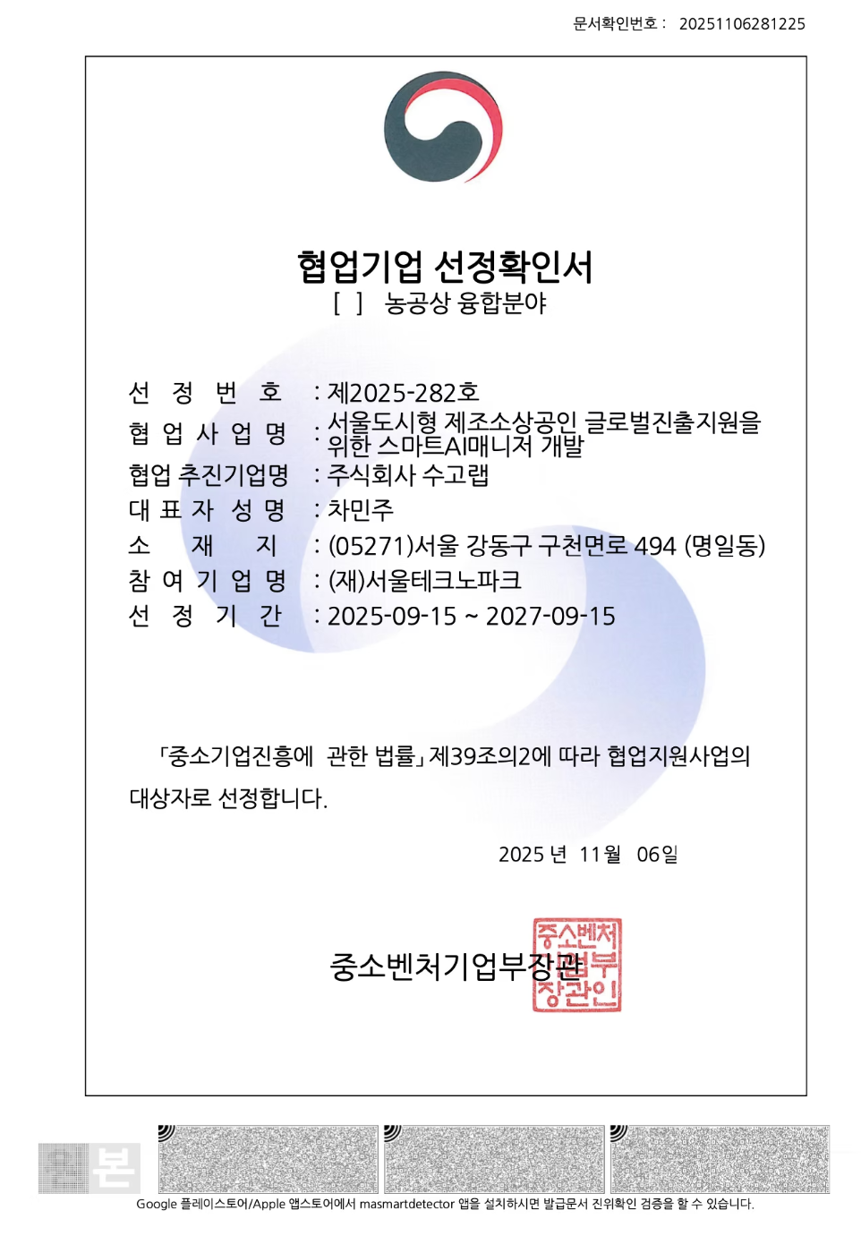 벤처기업 인증과 기업부설연구소 설립을 완료하였다. 여기에 더해 우리는 상표·디자인 저작권 등록, AI 알고리즘 저작권 인증, ISO 정보보호 인증(ISO27001)까지 법과 제도 위에서 공식적으로 보호받는 수고랩만의 AI 기반 글로벌 판로 확장 시스템을 구체화하고 있다.