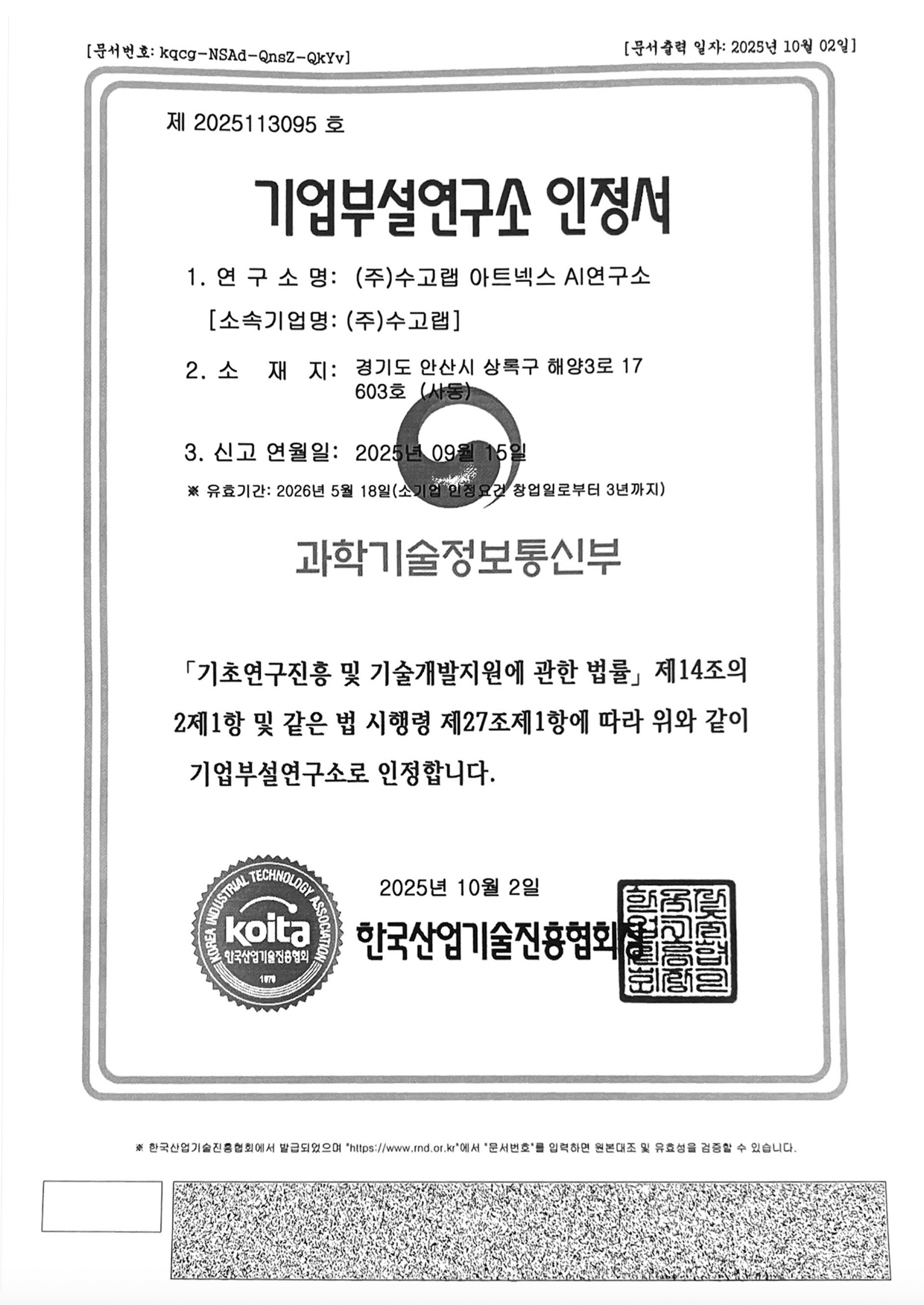 더 이상 ‘프로토타입’이 아니라 법과 제도 위에서 보호받는 공공연한 산업자산으로 자리잡은 수고랩의 스마트매니저 'ARTNEX'는 “공공형 AI SaaS 모델"으로 단순한 자동화 시스템이 아니라, 데이터 기반 의사결정이 가능한 AI 브랜드 전략 엔진으로 묵직한 기술과 책임으로 존재를 증명하는 팀이 되고자 우리의 거점지구 경기TP에서 조용히 연구를 이어가고 있다.