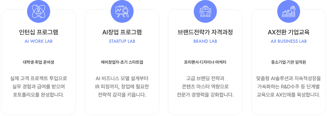 수고랩의 교육기반 비즈니스 모델은 바로 여기서 시작됐다. 우리는 우리의 인재, 'AI창업가'를 늘리기 위해 4가지 프로그램을 운영하고 있다.