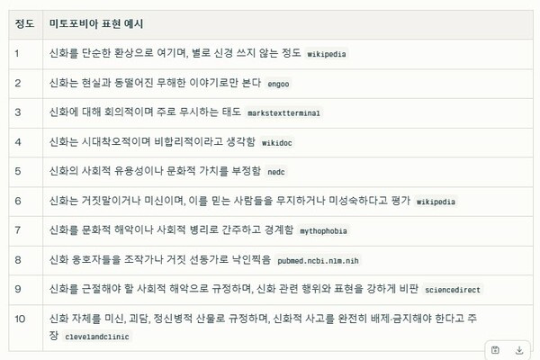 미토헤이트mytho-hate는 신화, 이야기, 또는 거짓 진술에 대한 극단적인 공포나 혐오를 나타내는 개념으로, 이전에 언급된 표현들(신화 자체의 부정, 신화 옹호자들의 조작적 오용 비난, 신화 퇴출 주장, 신화 풍요 주장의 위험성 지적, 신화의 미신적 본질 강조 등) 밖에도 다양한 형태로 나타난다. 이는 심리학, 문화비평, 일상 담론에서 관찰되는 패턴으로, 신화를 '비합리적 오류'나 '사회적 해악'으로 보는 태도를 반영한다. 아래에 추가적인 미토-헤이트의 표현 사례들을 쭉 나열하겠다.