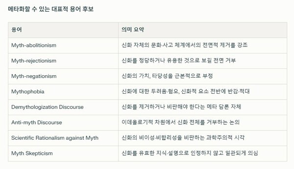 이런 '탈신화화'demythologisation, '신화-과학 충돌설'conflict thesis, '신화=미신론'superstition, error을 더 상위 수준에서 하나로 퉁치며 메타화할 수 있는 용어를 제안한다면, 아래와 같은 후보군이 있다.