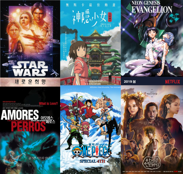 영화·드라마·애니메이션 분야는 신화풍요의 계보들이 무성한 정글이라 할만 하다. 아래짤은 신화리디스크립션의 대표적인 사례들이다. 『반지의 제왕』,『해리 포터』,『나니아 연대기』,『왕좌의 게임』,『신비한 동물사전』,『판의 미로』,『어벤져스』시리즈, 『헝거 게임』『퍼시 잭슨』같은 영화들은 생략하고, 몇 개만을 살펴보기로 하자.