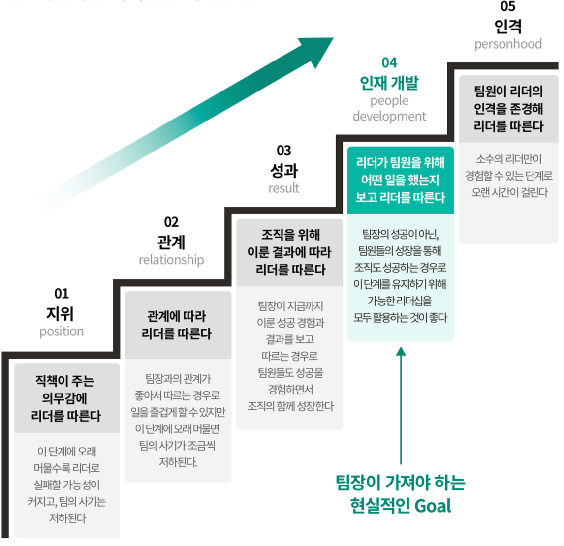 리더십의 대가 존 맥스웰의 저서 ‘누가 최고의 리더가 되는가’에서는 5단계 리더십을 제시하고 있다.가장 낮은 단계인 지위 리더십부터 관계 리더십, 성과 리더십, 인재 개발 리더십, 가장 높고 어려운 단계인 인격 리더십까지.