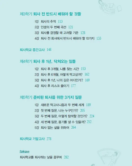 본 <퇴사학교>에서는 다가오는 퇴사의 시대를 조명하고(1학기), 지금 내 회사 생활이 왜 힘든지를 진단한 뒤(2학기), 회사에서 무엇을 배우고 졸업할지를(3학기) 고찰할 것입니다. 그리고 퇴사 이후 맞닥뜨리는 진짜 현실에서의 교훈과(4학기), 이를 기반으로 준비된 퇴사를 위한 행복한 먹고사니즘의 대안을 3가지 질문을 통해(5학기) 탐구할 것입니다.