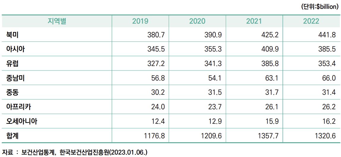 실제로 2022년 세계 제약 시장의 규모는 2019년 대비 12.22% 증가하여 약 1조 3,206억 달러에 달했습니다. 이 중에서 세계 최대 의약품 시장인 미국의 시장 규모는 4,418억 달러로 집계되었습니다. 특히 아시아는 2019년 대비 11.6% 성장을 하며 2번째로 높은 비중을 보이며 매년 점유율을 확대하고 있습니다.