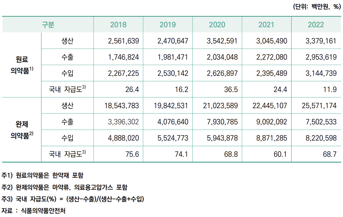 국내 의약품 자급도를 살펴보면, 2019년 대비 2022년의 원료 의약품의 수출액은 69.09%, 완제 의약품의 수출액은 무려 120.9% 증가했으며 이는 한국 제약 회사의 글로벌 경쟁력이 꾸준히 향상되고 있음을 시사합니다. 반면, 국내 자급도는 줄어들고 있는 것을 보아 글로벌 시장에서의 성과가 더욱 중요해지고 있음을 나타냅니다.