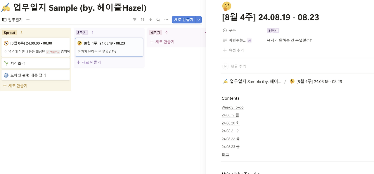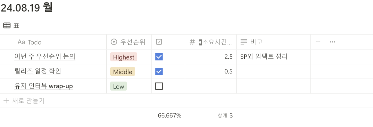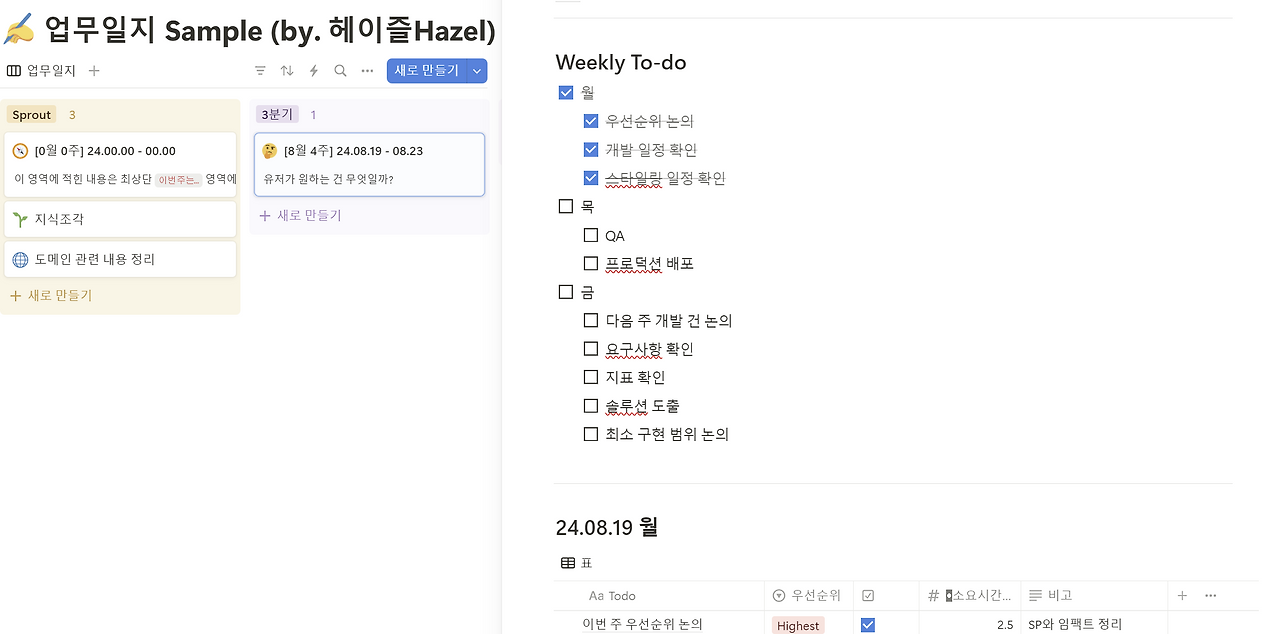 솔직히 말하면 이직하기 전에는 이 영역을 정말 유용하게 활용했는데 이직한 현재 회사에서는 스프린트 주기가 일주일로 거의 동일한 To-do 리스트가 작성되다보니 Weekly To-do 영역보다는 해당 요일의 할 일 목록에 미리 추가해두는 편입니다. 안 그러면 같은 내용을 두 번 작성하게 되더라구요. 상황에 맞게 활용하면 될 것 같습니다.
