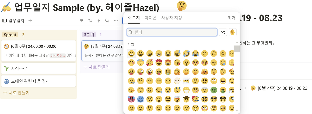 더불어 최상단 이모지 설정을 통해 그 주의 느낌을 이모지로 표현할 수도 있습니다.