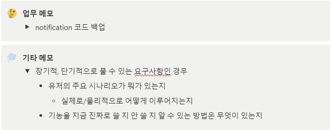 업무 메모의 경우, 주로 그날 업무를 수행하는 데 있어 도움이 되는 정보들을 적는 편이에요. (예를 들면 미팅 전 간략히 준비할 내용을 적거나 코드 수정하기 전 기존 코드를 메모장처럼 백업해 두거나...)