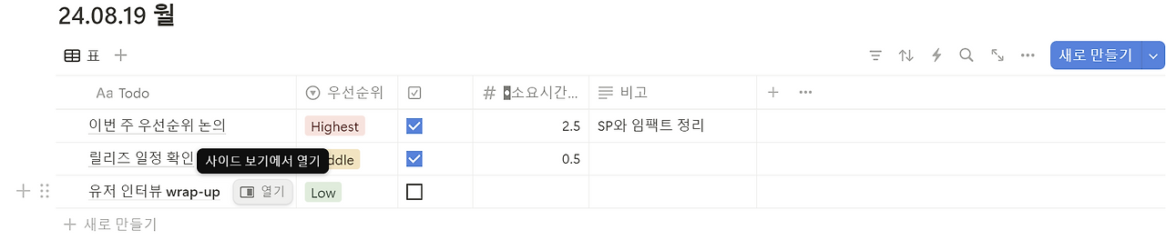 할 일에 마우스를 올리면 '열기' 버튼이 보입니다각 업무에 대한 상세 내용은 할 일을 눌러 기록할 수 있습니다.
