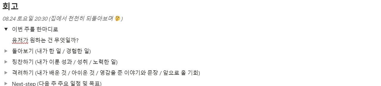 저는 주로 주말에 쇼파에 앉아 유튜브를 틀어놓고 간략하게 회고하는 시간을 가집니다. 사실 일주일에 한 번씩 그 주를 돌이켜보는 건 생각보다 훨씬 성가시고 귀찮은 일입니다. 그래서 시간을 너무 오래 들이거나 지나치게 몰입하지 않으려고 합니다. 그렇지 않으면 회고를 건너뛰는 횟수는 많아질 테니까요.