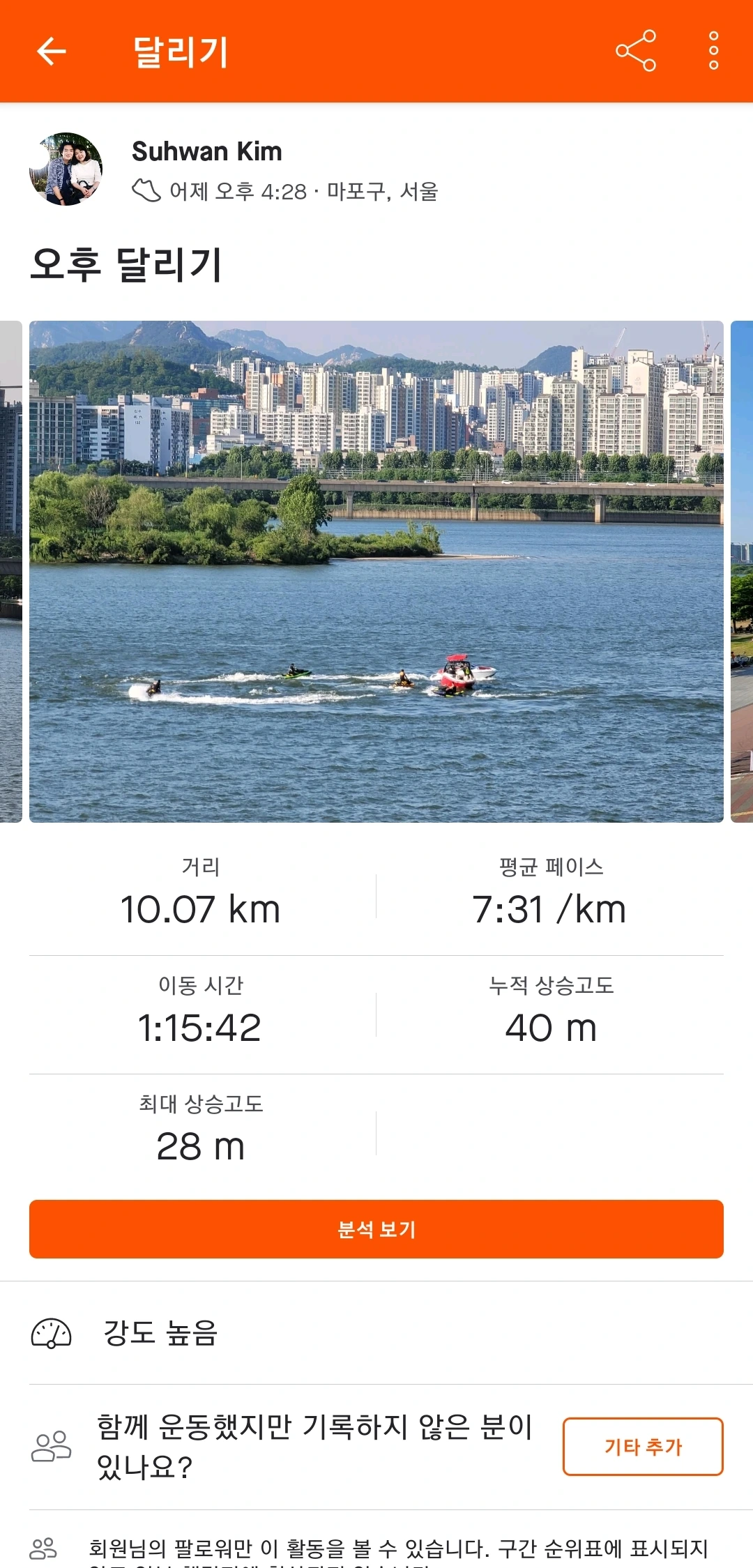 이때 사용하는 어플이 Strava (ID: Suhwan Kim)이다.