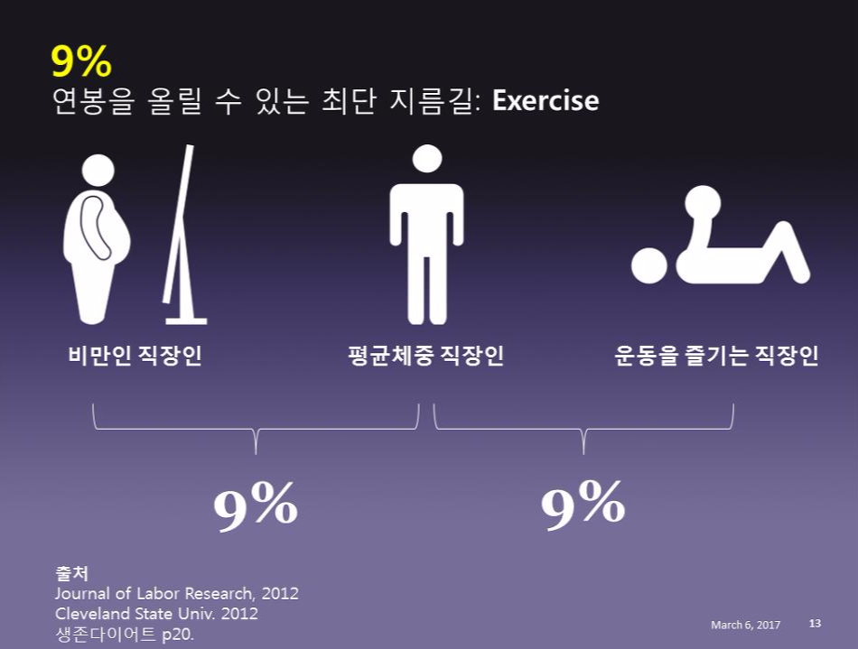 나는 '비만'이 아니니 괜찮다는 생각이 드는가? 같은 연구에서 '평균 체중인 직장인'과 '운동을 즐기는 직장인' 사이의 연봉 차이는 다시 9%로 조사되었다. 그렇다면 '비만인 직장인'과 '운동을 즐기는 직장인' 사이의 연봉 차이는 단순 산수에 의해 18% (9% + 9%)라고 할 수 있다.