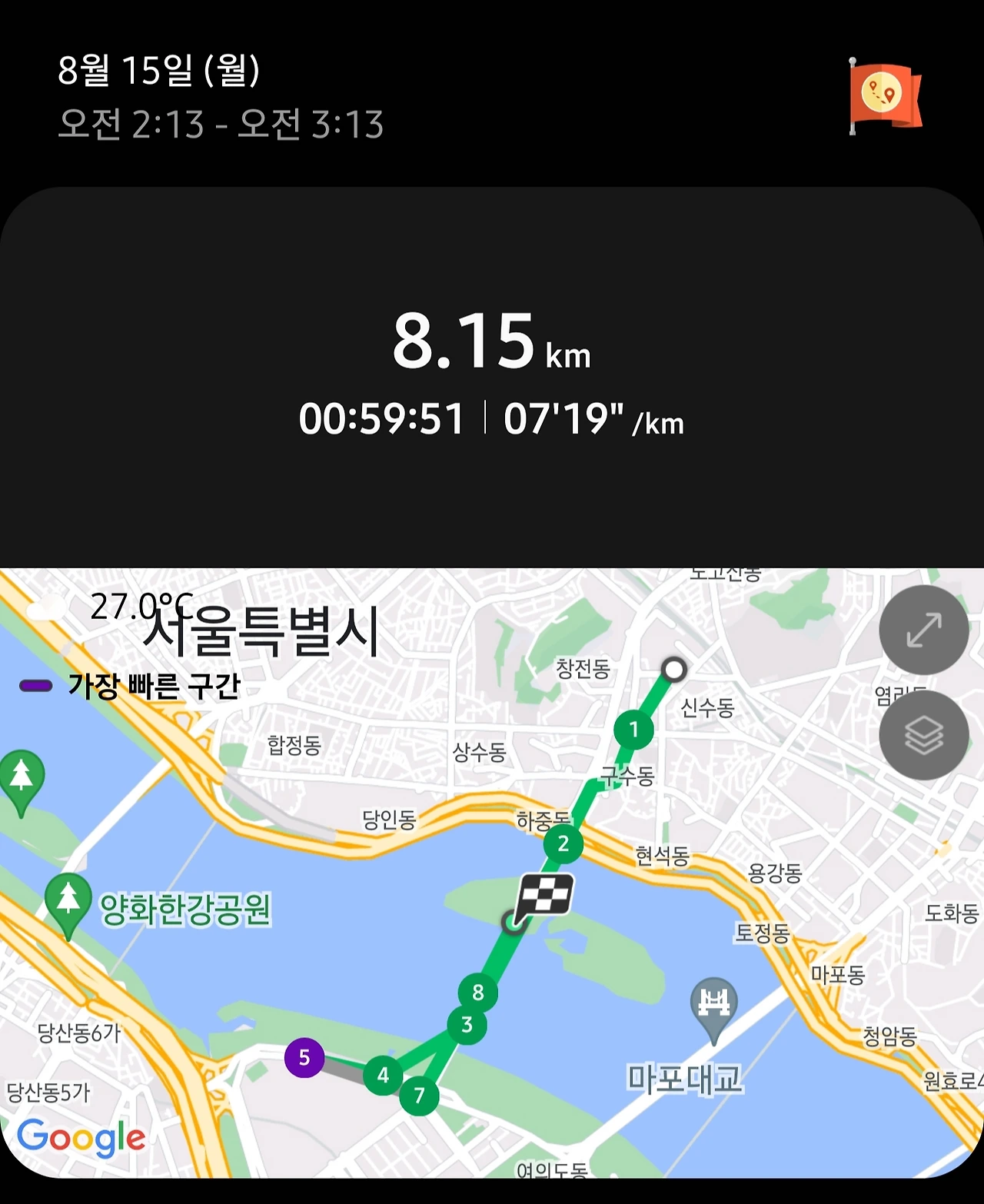 서강대교 한가운데서 8.15km를 완성했습니다. 59분 51초 만이네요.
