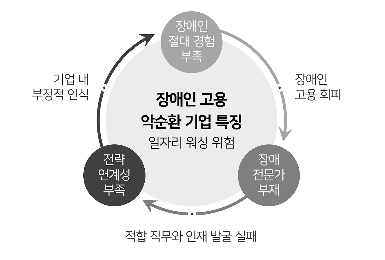 정부는 장애인 고용을 촉진하기 위해 다양한 지원 제도를 신설하고, 실무 현장과의 간극을 좁히고자 매년 관련 법안의 제개정을 거치고 있으나, 여전히 거시적 정책만 있을 뿐 직무 단위의 미시적 대안과 솔루션이 부족한 상황이다. 나는 다양한 산업 현장에서 장애인 고용에 대한 성공과 실패 사례를 직간접적으로 경험하며, 장애인 고용 악순환이 반복되는 곳의 세 가지 특징을 발견했다.