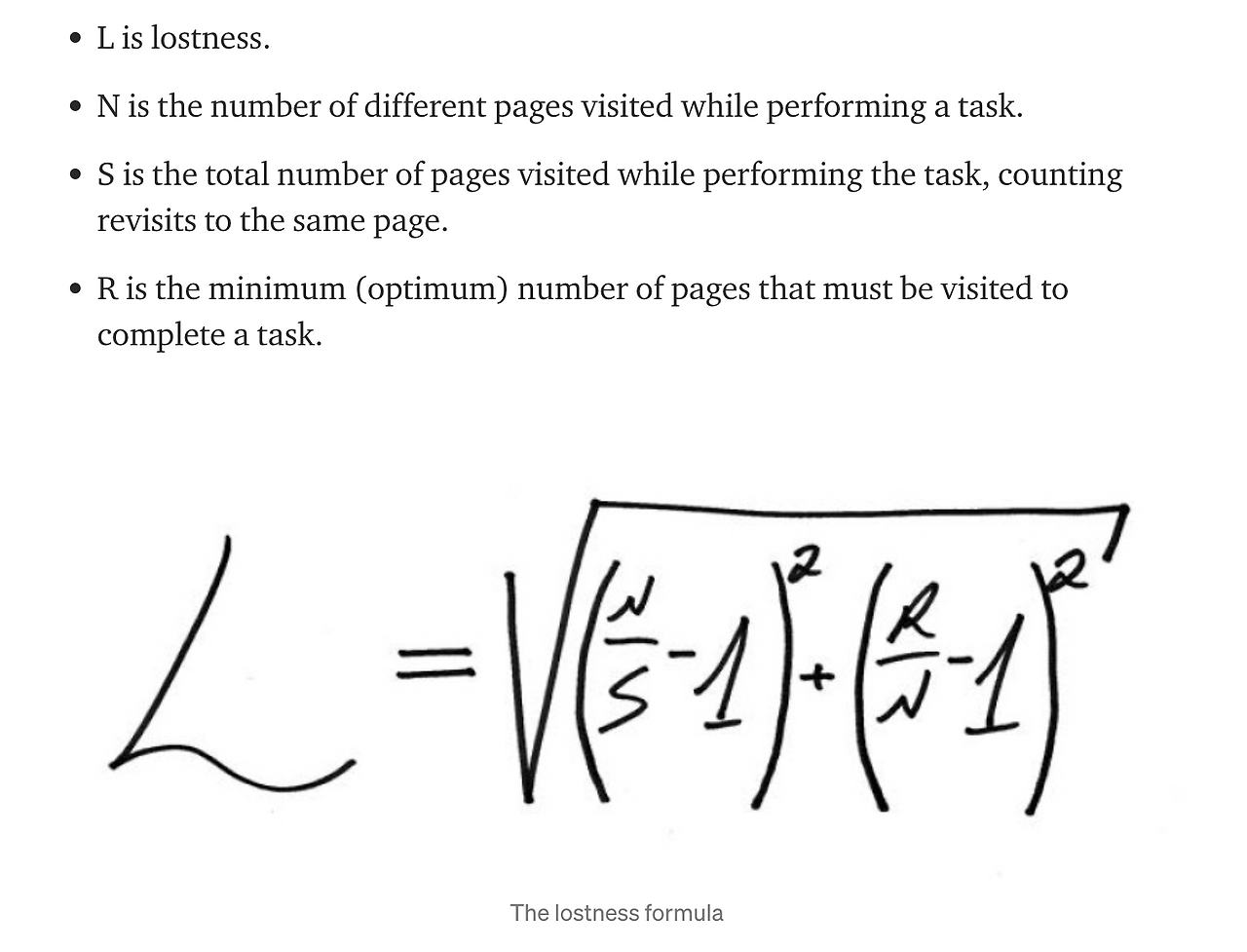경로를 놓치는 것의 측정은 디지털 제품을 사용하는데 있어 효율성을 측정하는 것입니다. 사람들이 제품을 사용할 때 얼마나 길을 잃었는지를 알려줍니다. Lostness 점수는 0에서 1의 범위인데, 높은 점수일 수록 사람들은 길을 잃고 필요한 것을 찾는데 어려워하는 것을 의미합니다. 낮은 점수는 사람들이 원하는 것을 비교적 쉽게 찾을 수 있음을 의미하죠. Lostness는 사용자가 작업을 완료하는데 걸리는 최적의 스텝을 계산합니다.