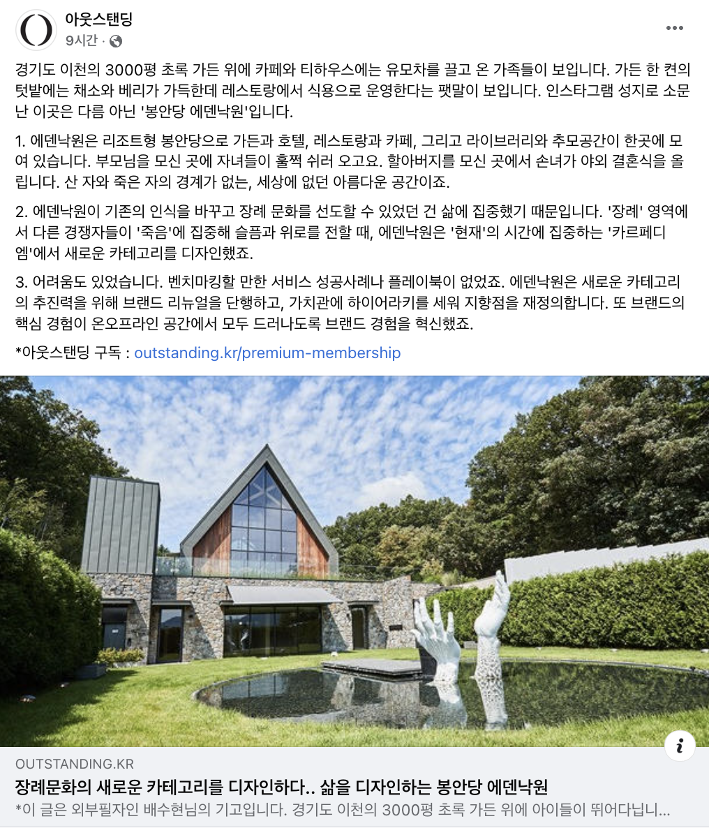 장례문화의 새로운 카테고리를 디자인하다.. 삶을 디자인하는 봉안당 에덴낙원 *이 글은 외부필자인 배수현님의 기고입니다. 경기도 이천의 3000평 초록 가든 위에 아이들이 뛰어다닙니다. 카페와 티하우스에는 유모차를 끌고 온 가족들이 보입니다. 가든 한 켠의 텃밭에는