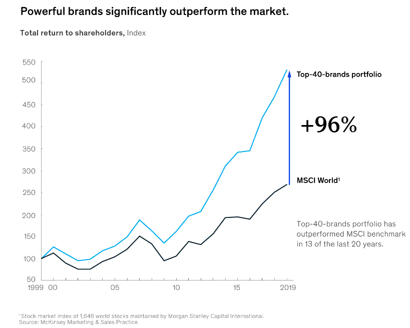 신기한건, 브랜드가 강력할 수록 시장에서 뛰어난 성과를 보이고 있다는 겁니다. 그래프를 보면, 세계에서 가장 강력한 40개의 브랜드들은 지난 20년간 투자에 2배에 달하는 주주 수익을 달성했습니다.