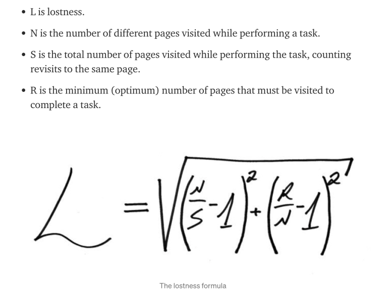 경로를 놓치는 것의 측정은 디지털 제품을 사용하는데 있어 효율성을 측정하는 것에 해당합니다. 사람들이 제품을 사용할 때 얼마나 길을 잃었는지를 알려주는데요. 상실 점수는 0에서 1의 범위인데, 좊은 점수일 수록 사람들은 길을 잃고 필요한 것을 찾는데 어려워하는 것을 의미합니다. 낮은 점수는 사람들이 원하는 것을 비교적 쉽게 찾을 수 있음을 의미하죠. 길을 놓치는 것은 사용자가 작업을 완료하는데 걸리는 최적의 스텝을 계산합니다.