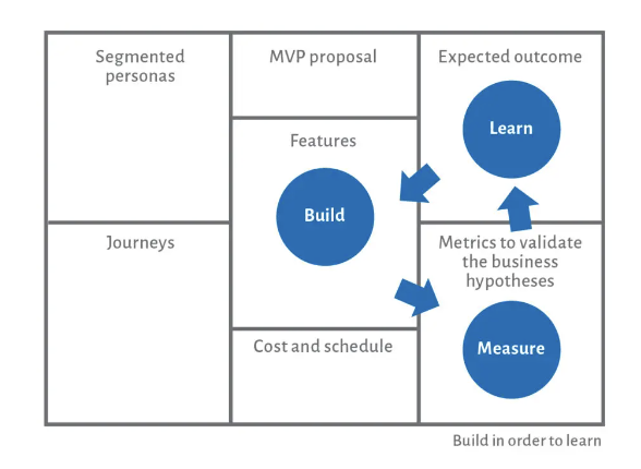 린 스타트업에는 구축(build)-측정(measure)-학습(learn) 루프가 있습니다. 이 루프는 MVP 캔버스 상에서 개발중인 기능(build), 기대하는 결과(learning), 그리고 가설을 검증하기 위한 지표(measure)로 나타납니다. 이 루프를 통해 다음의 질문이 도출되며, 이 질문에 대한 응답을 통해 MVP를 정교화 합니다.