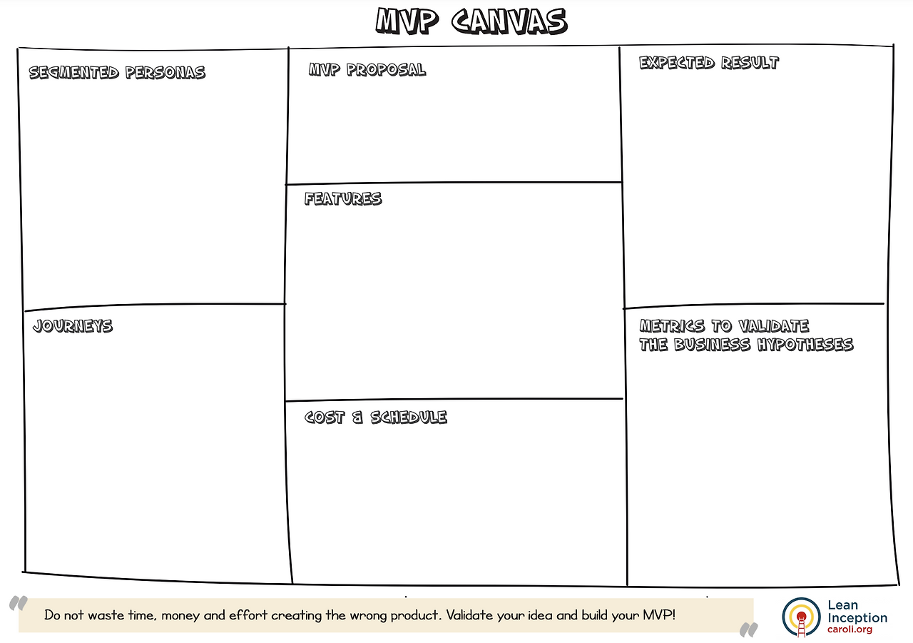 MVP 캔버스는 Lean Inception 책에 상세히 설명되어 있습니다. 책에서는 MVP에 대한 설명 뿐 아니라, 워크샵 실행 방법도 설명하고 있습니다. MVP 캔버스는 Lean Inception 워크샵의 마지막 활동입니다.